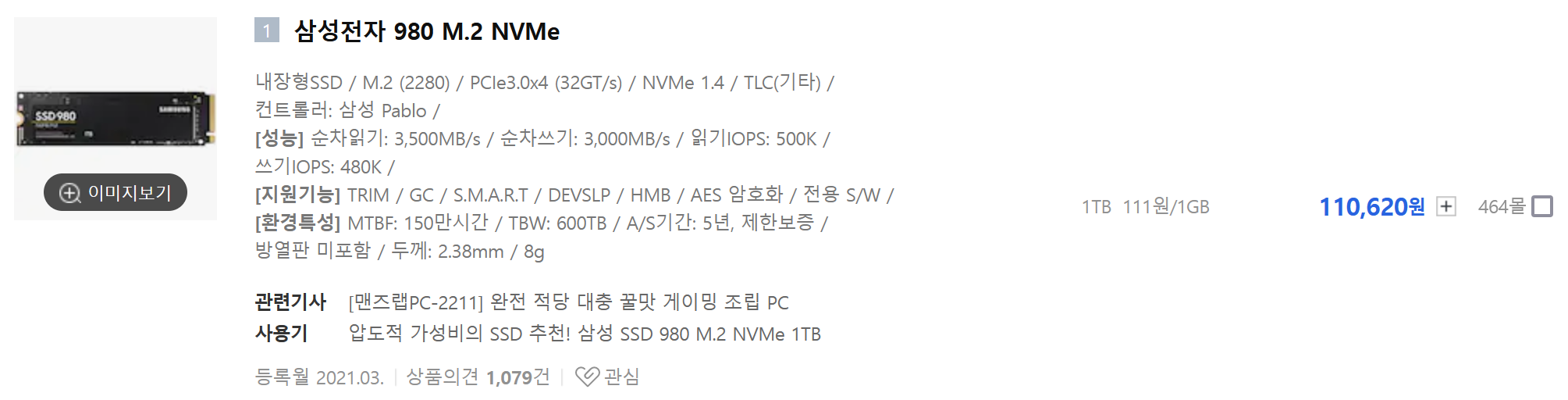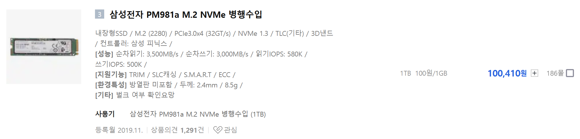NVMe M.2 2280, PCIe3.0x4, 1TB, DRAM 포함 제품 군으로 IPS 읽기, 쓰기 모두 501 이상 제품입니다.