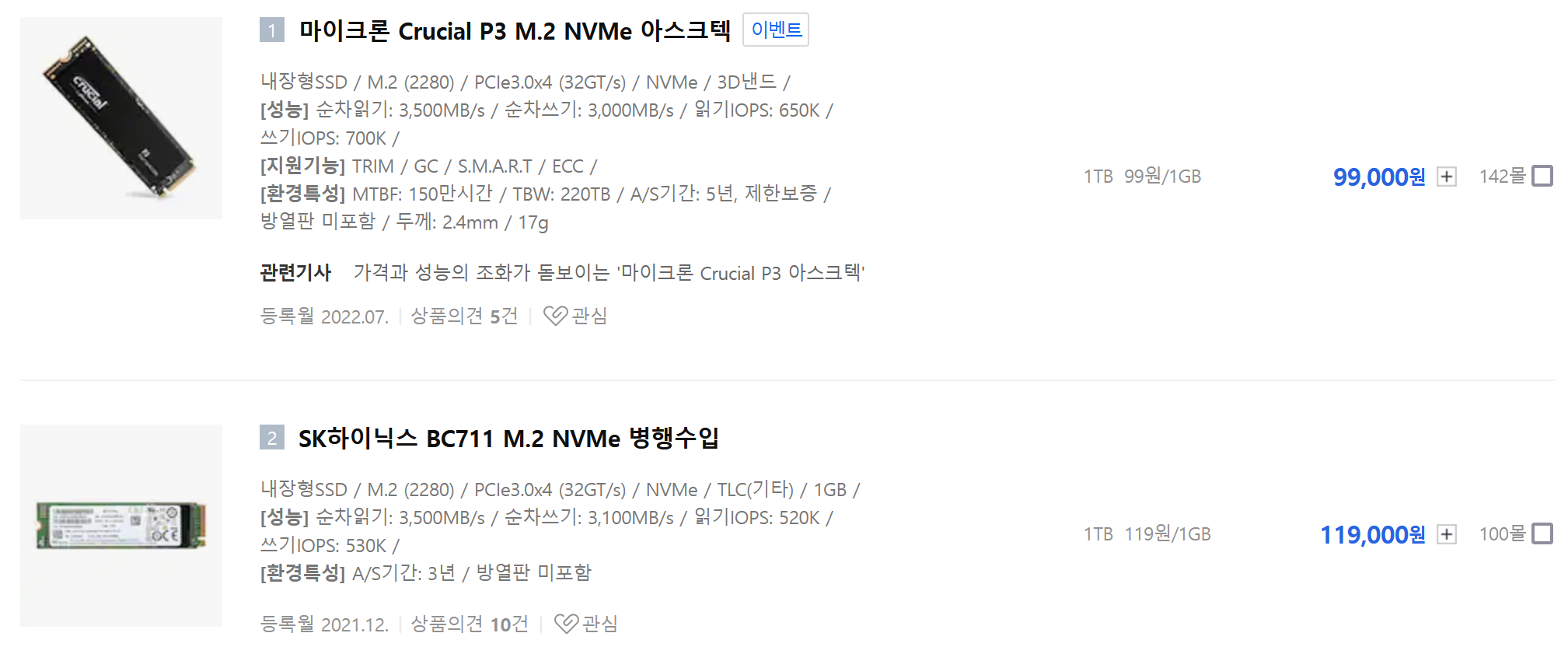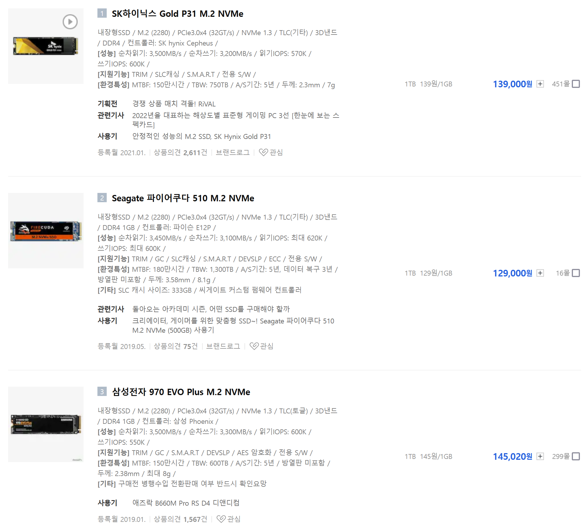 아래는 현재 가격과 구매를 고려하던 시점에 찾아본 제품군들입니다. DRAM이 있으면 좋은데...라는 생각을 많이 했지만 뭐 가격적인 메리트는 얇은 주머니 사정을 고려하면 좋은 선택이라고 셀프 위로를 하고 있습니다.