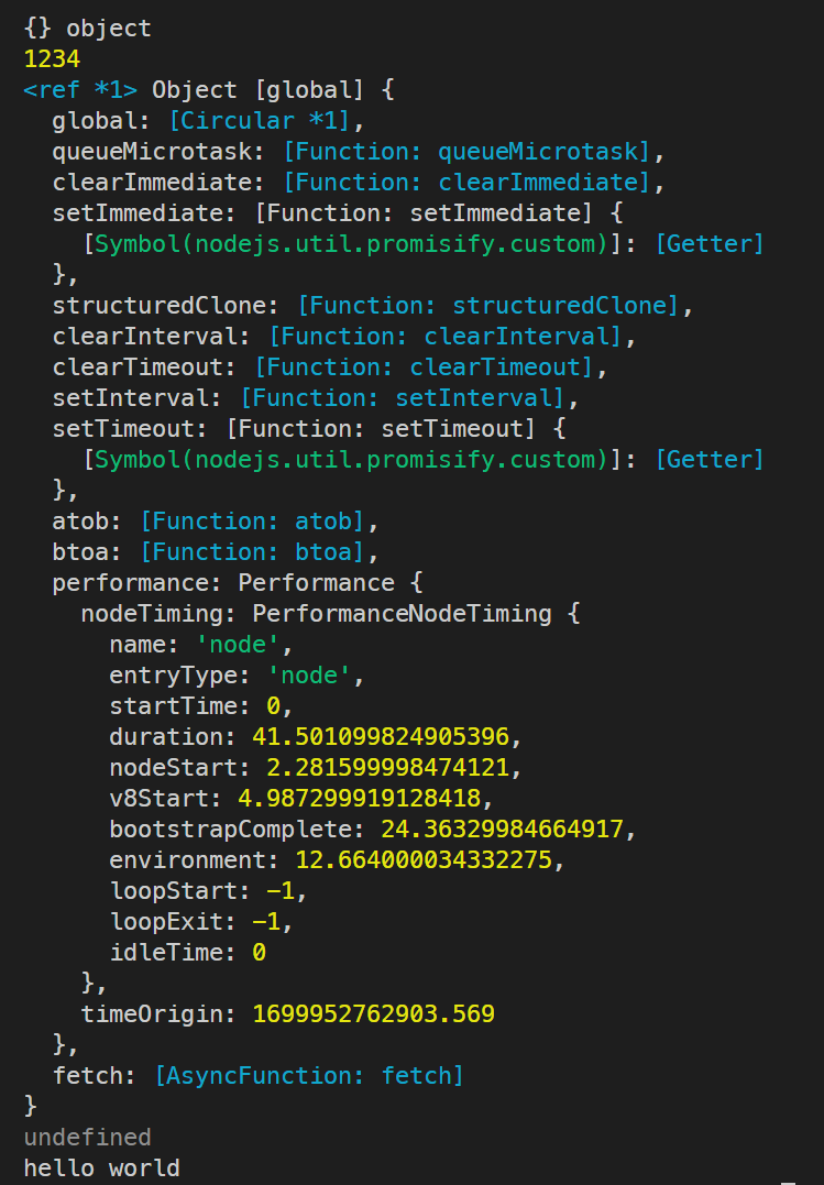 node는 프로그램 실행 중에 global 컨텍스트에서 this는 빈 객체를 반환합니다.