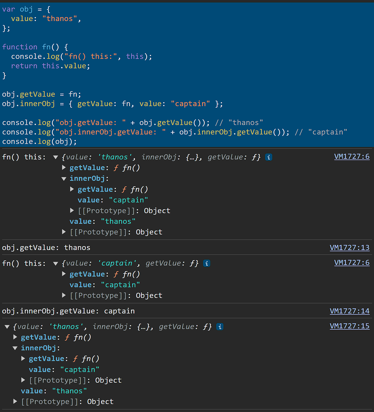 함수 fn은 obj의 getValue 메서드와 obj의 inner object의 getValue 메서드로 동일한 함수를 사용하였습니다. 객체의 메서드를 호출하면 메서드(함수 fn)가 참조하는 this 값은 메서드를 할당한 객체를 가리키고 있습니다. 따라서 메서드를 호출한 객체의 value 값을 각각 반환합니다.