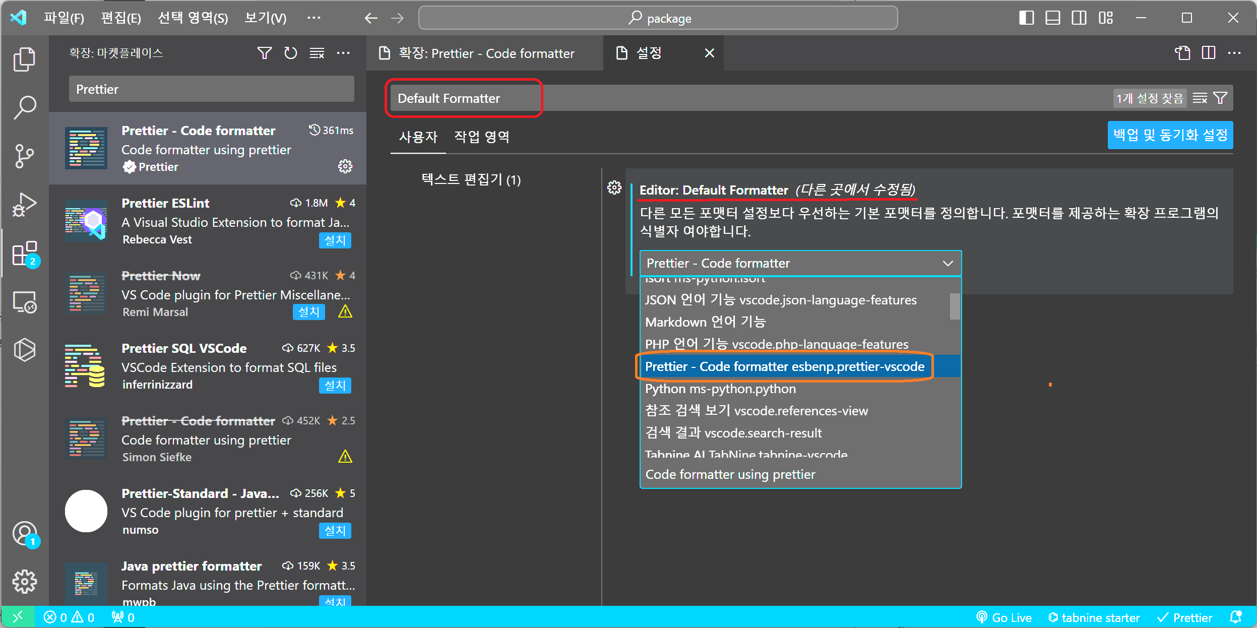 - 검색 결과에서 Prettier - Code formatter를 클릭합니다.