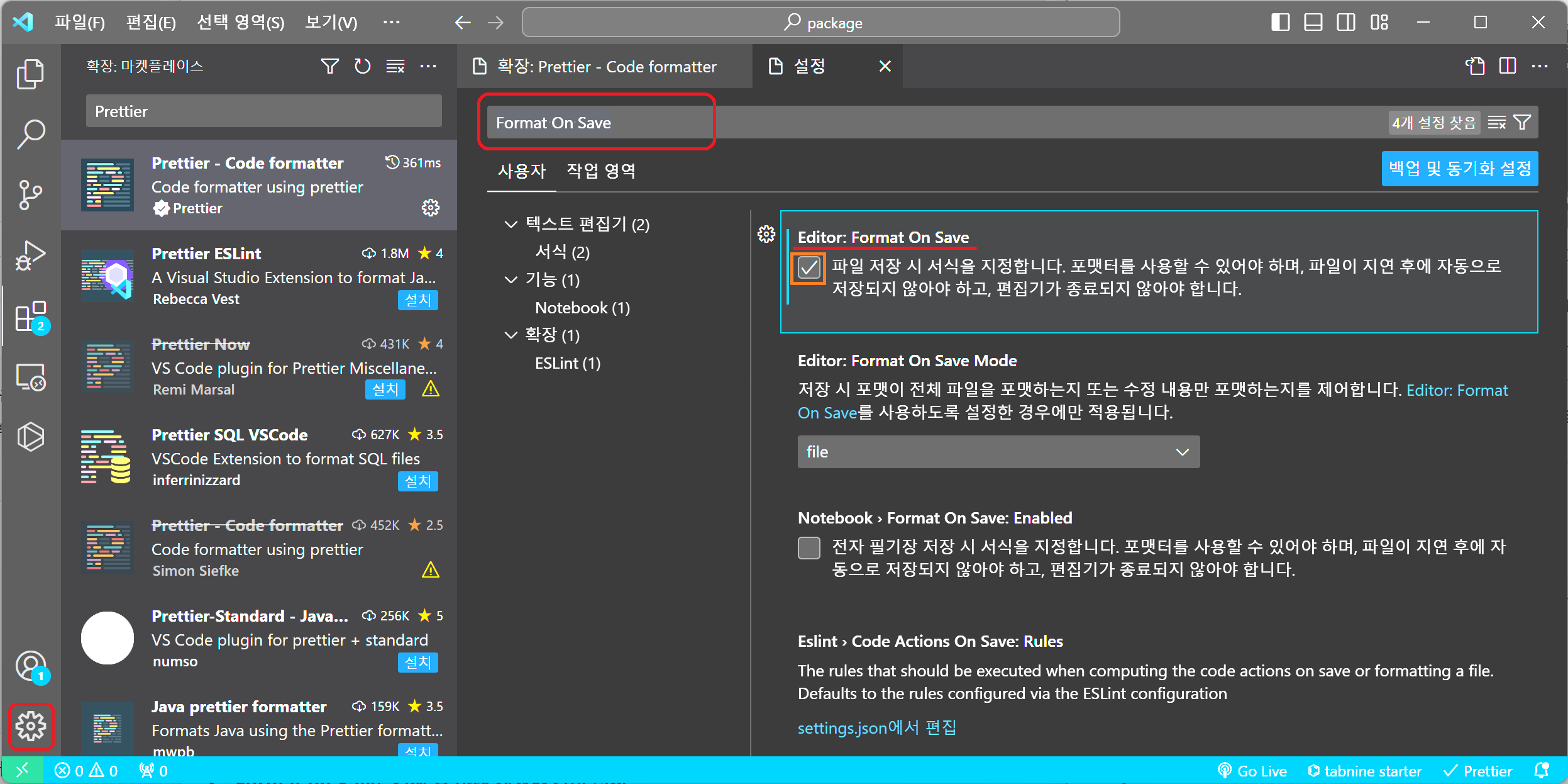 3. Editor: Format On Save의 체크박스를 확인하고 체크합니다.