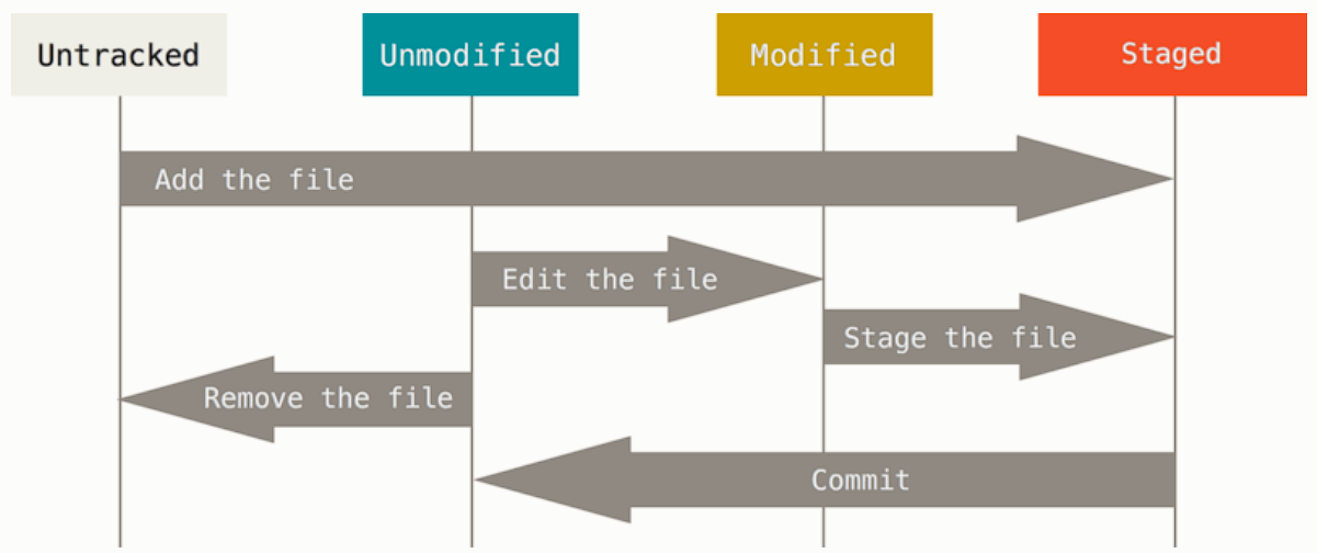 - Unmodified(수정하지 않음)와 Modified(수정함) 그리고 Staged(Commit으로 저장소에 기록할) 상태 중 하나이다.