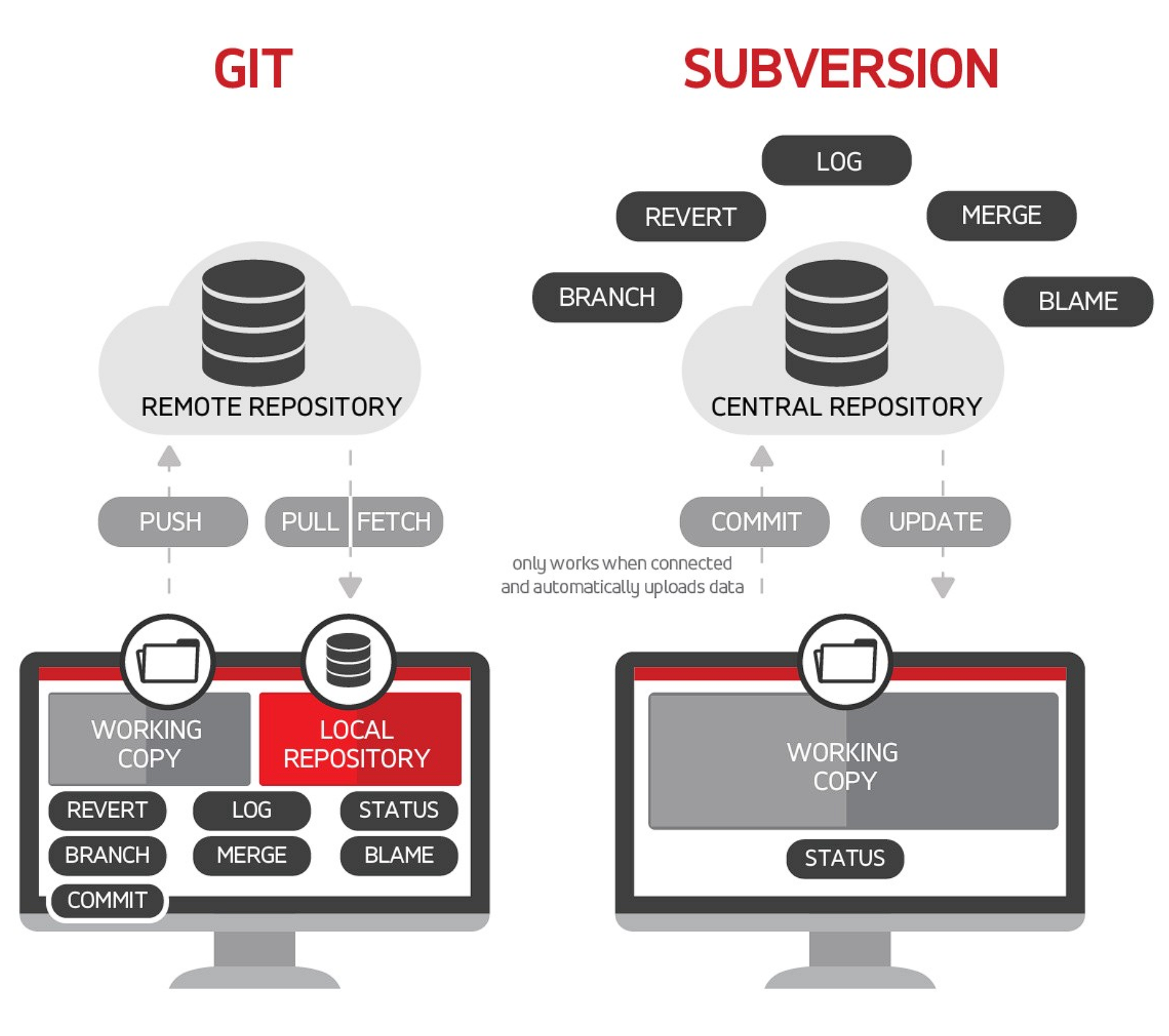 두 VCS의 큰 차이점은 핵심 아키텍처에 있습니다. SVN은 중앙 집중식으로 동작하고, Git의 버전 제어는 분산하여 동작합니다. 그러나 이는 빙산의 일각에 불과합니다. 둘 중 하나를 효과적으로 사용하려면, 접근 방식과 기능의 서로 다른 변형을 이해하는 것이 중요합니다.
