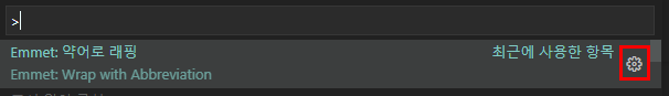 1.3절에서 사용한 'Emmet: 약어로 래핑'을 검색해보면 우측에 기어모양의 아이콘이 있고 이를 클릭하면 설정 화면으로 들어갑니다.