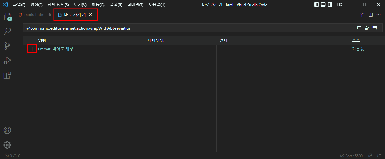 한 번 위와 같이 하면 Ctrl + Shift + P를 누르고 마우스로 'Emmet: 약어로 래핑' 계속 실행을 할 수 있습니다만 저는 단축키가 있으면 좋겠다는 생각이 들어 단축키를 추가하였습니다.