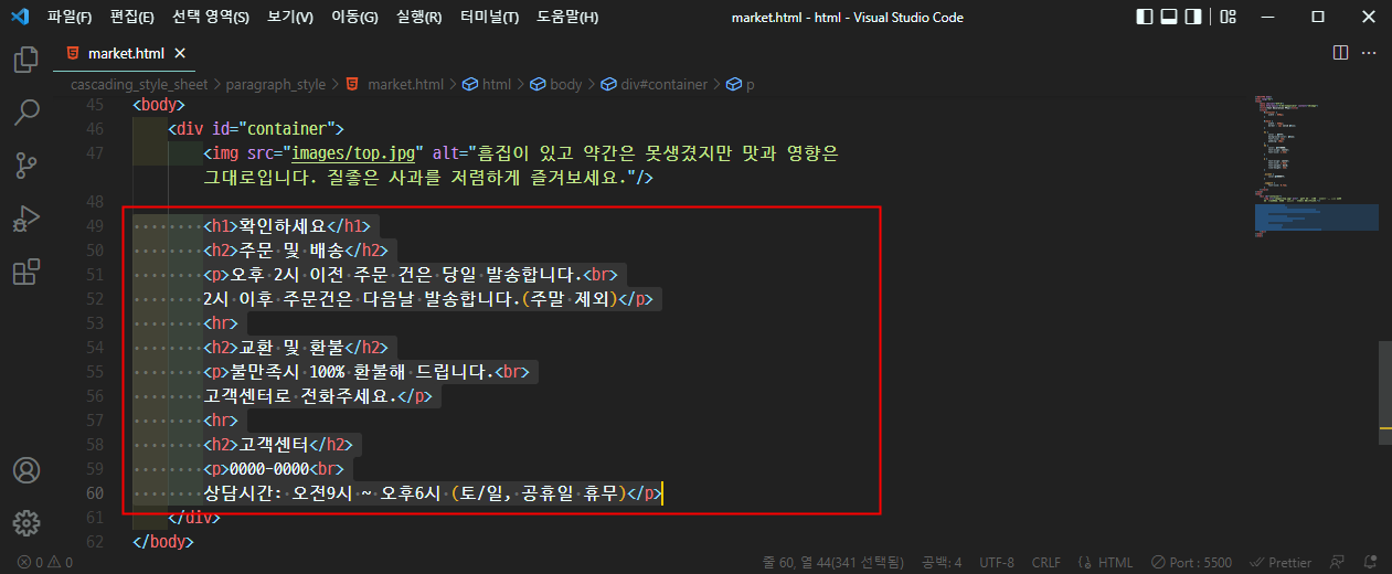 선택 영역을 감싸는 기능(Emmet 래핑Wrap)이니, 먼저 코드 블록을 선택합니다.