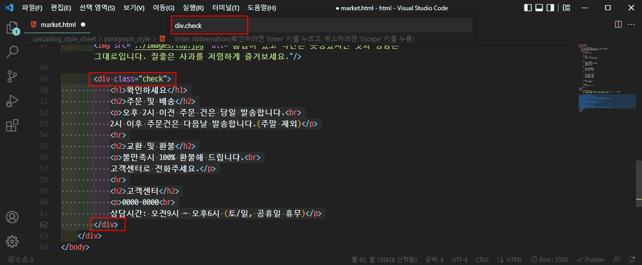 위의 선택한 블록에서 기능을 수행하면 div.check를 입력하는 순간 실시간으로 선택영역이 태그로 감싸지는 것을 볼 수 있습니다.