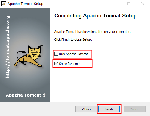 Run Apache Tomcat과 Show Readme 옵션을 선택할 수 있습니다. 바로 실행하고, 문서를 조회하려면 체크 표시를 해둔 채 Finish를 클릭합니다.