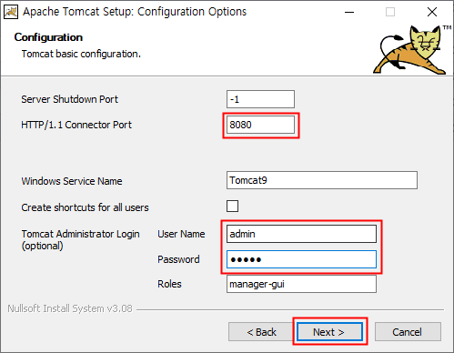 만약 Port를 변경하고 싶다면 여기서 8080 대신 본인이 원하는 Port번호를 적을 수 있습니다. 나중에 Tomcat 설정 파일을 수정하면 바꿀 수 있으니 기본으로 설정하고 넘어가도 무방합니다.