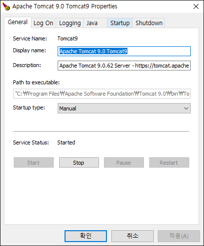 서비스로 Tomcat이 실행 중이면 Start service 메뉴가 비활성화된 것을 확인할 수 있습니다.