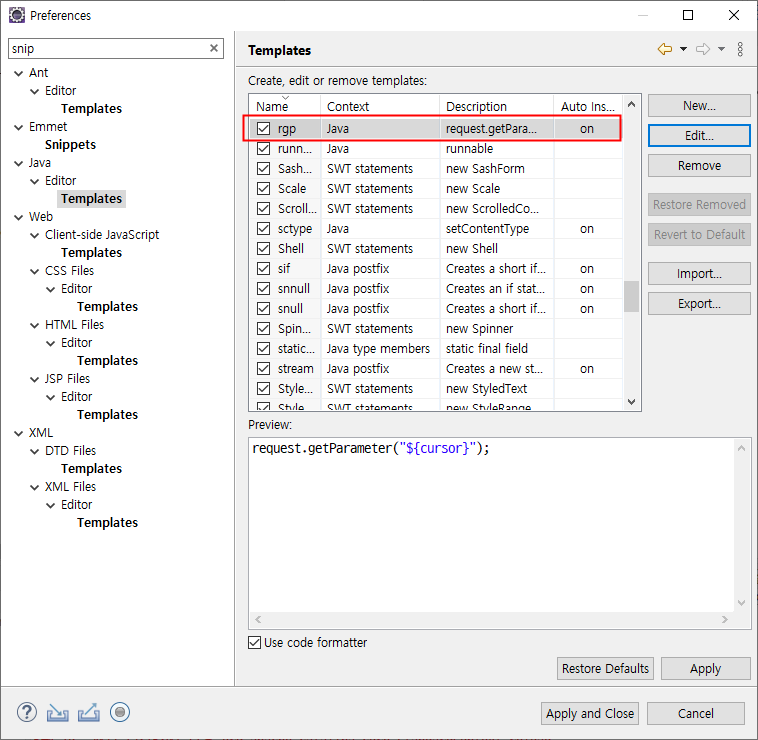 저는 Emmet을 설치하여 Snippets 항목도 함께 조회가 되네요. Templates 항목을 입력하면 다른 형태로 보이지만 Java > Editor > Templates 항목을 찾을 수 있습니다.