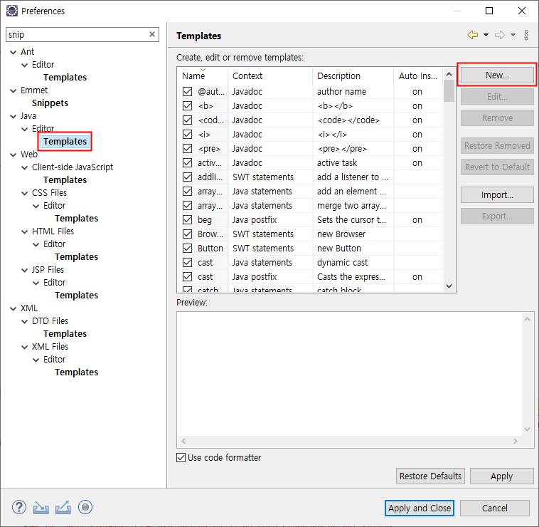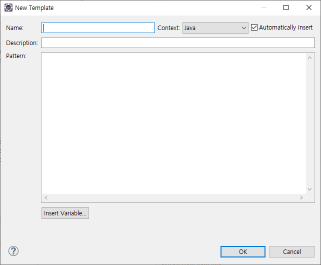 여기서 'New...' 버튼을 클릭해서 'New Template' 창을 띄우고 여기서 사용자 정의 Template 항목을 추가할 수 있습니다.