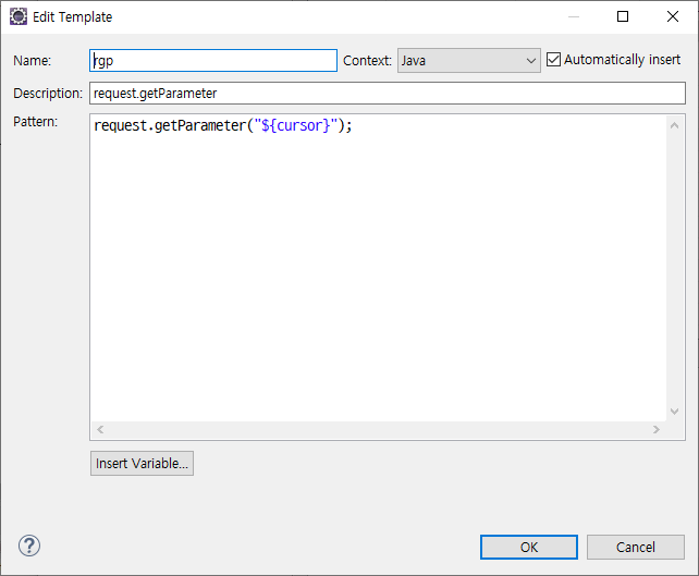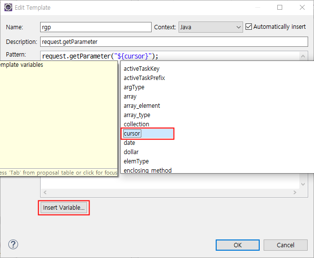 실제로 화면에 자동으로 입력되는 내용(Pattern)은 에디터 영역에 입력합니다. ${cursor}는 변수로서 자동 완성 후 커서가 위치하는 자리를 나타냅니다. 입력 방법은 직접 타이핑도 가능하지만 [Insert Variable...] 버튼을 클릭하여 입력할 수도 있습니다.
