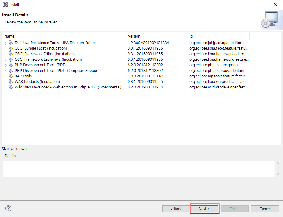 설치할 내역을 확인하고 Next를 클릭합니다.