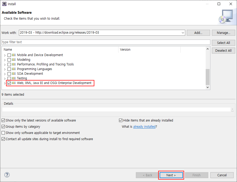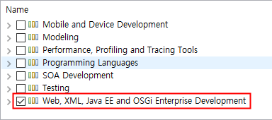 스크롤 다운한 다음 Web, XML, Java EE and OSGi Enterprise Developmet를 선택합니다.