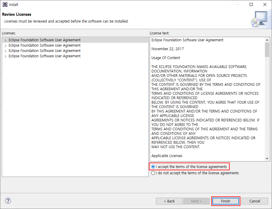 위와 같은 라이선스 확인 및 동의 화면에서 'I accept the...'를 체크하고 Finish를 누르면 설치를 시작합니다.