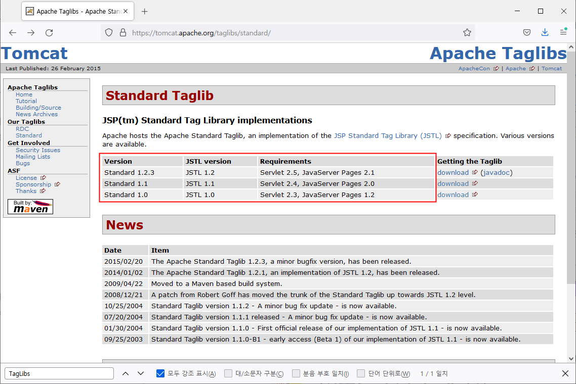 Standard Taglib 라이브러리는 http://tomcat.apache.org/tagliabs/standard 에서 다운로드할 수 있으며 현재 3개의 버전을 배포하고 있습니다.