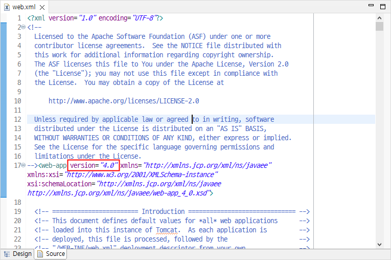 Tomcat에서 어떤 Servlet 버전을 사용하고 있는지 확인하려면 web.xml을 열어 확인해보면 됩니다.