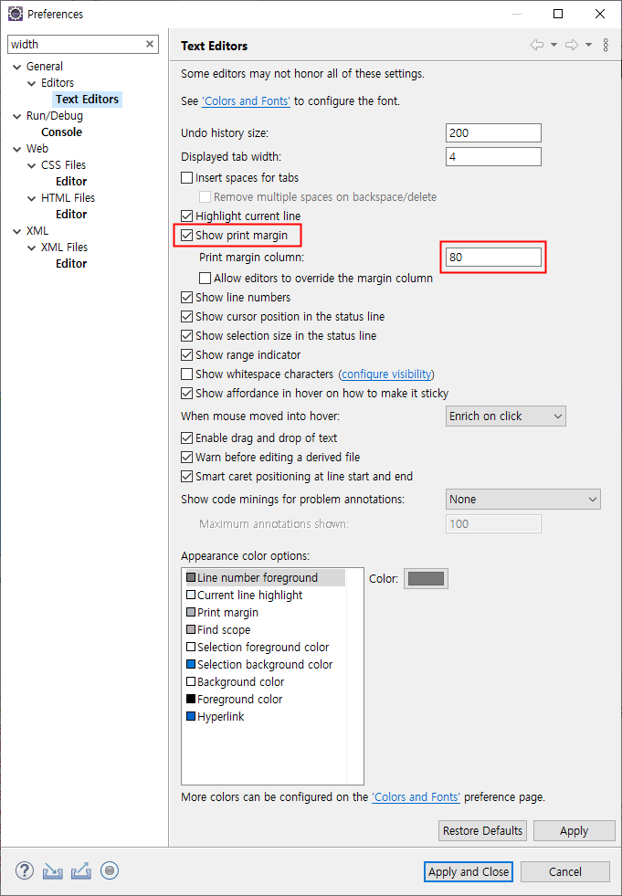 검색에 width를 입력하고, General > Editors > Text Editors 를 선택하면 아래와 같은 화면이 나옵니다.