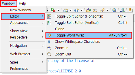 이클립스에서 자동 줄바꿈 기능은 토글 기능으로 메뉴에서 On/Off 가 가능하도록 만들어졌습니다. 메뉴는 [ Windows > Editor > Toggle Word Wrap ]입니다. 단축키는 Alt + Shift + Y 로 누를 때마다 On/Off 상태로 번갈아 가며 바뀝니다.