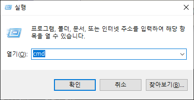 방법은 여러 가지가 있습니다만 저는 [윈도키+R] 키를 눌러 실행 창을 띄운 다음 'cmd'를 입력하고 실행합니다.