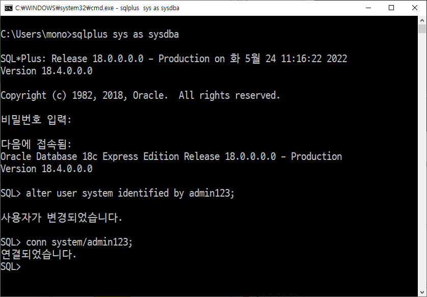 SQL*Plus: Release 18.0.0.0.0 - Production on 화 5월 24 11:16:22 2022