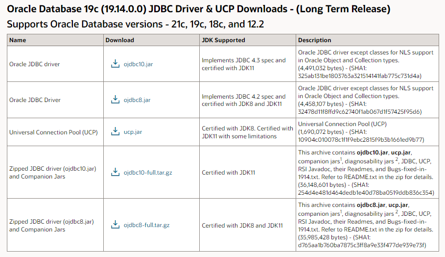 다운로드 페이지에 바로 적어주면 좋겠다는 생각도 들기는 하는데, JDBC 개발자 가이드 안을 찾아보니 찾을 수 있었습니다. 보다 상세한 내용이 궁금하면 아래 링크를 정독해보시면 됩니다.
