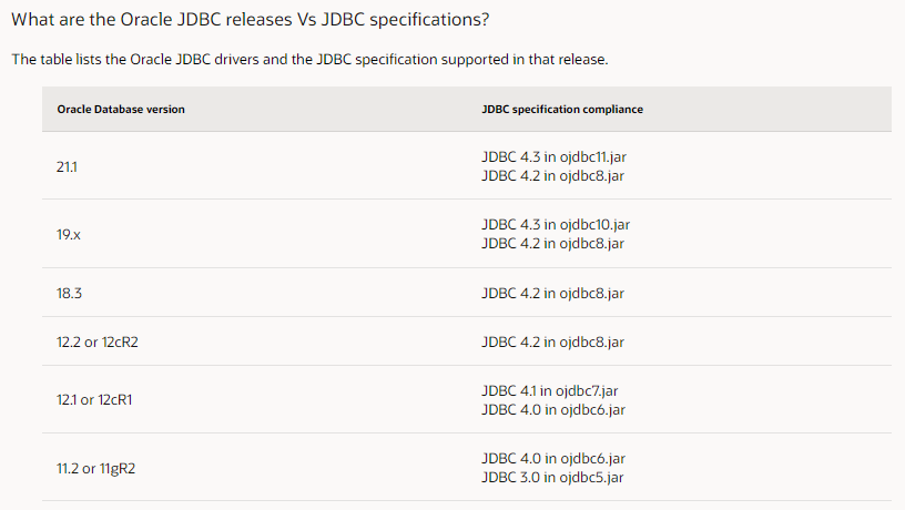 JDBC 스펙은 DBMS 버전별로 좀 더 차이가 납니다만 ojdbc8.jar는 JDBC 4.2 SPEC을 지원하고 있으며 ojdbc10.jar 와 ojdbc11.jar는 JDBC 4.3 SPEC을 지원하고 있습니다.