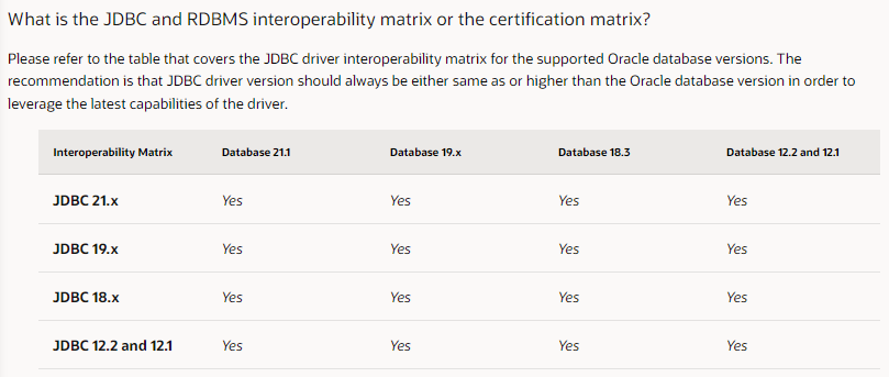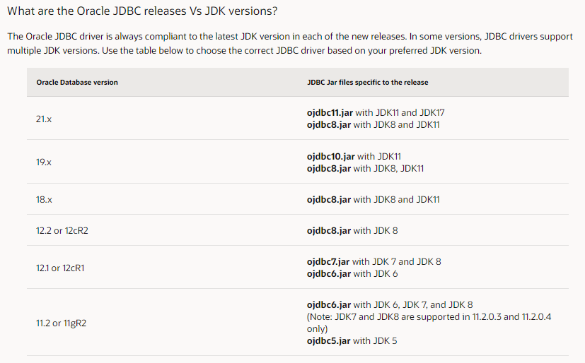 기본적으로 JDBC 드라이버는 11.2 이상의 DBMS와는 모두 호환이 된다고 되어 있습니다. 하위호환은 물론 상위호환도 된다고 되어있습니다. 즉 JDBC 11.2 드라이버로 DBMS 21.x 버전에 접속할 수 있습니다.