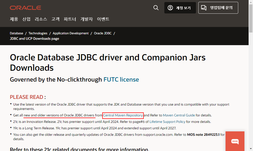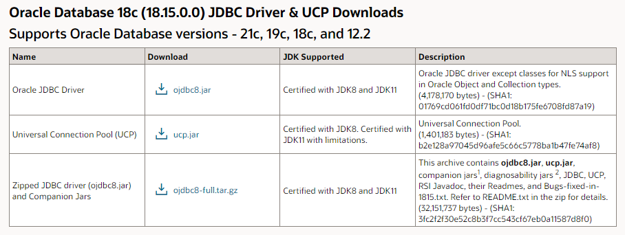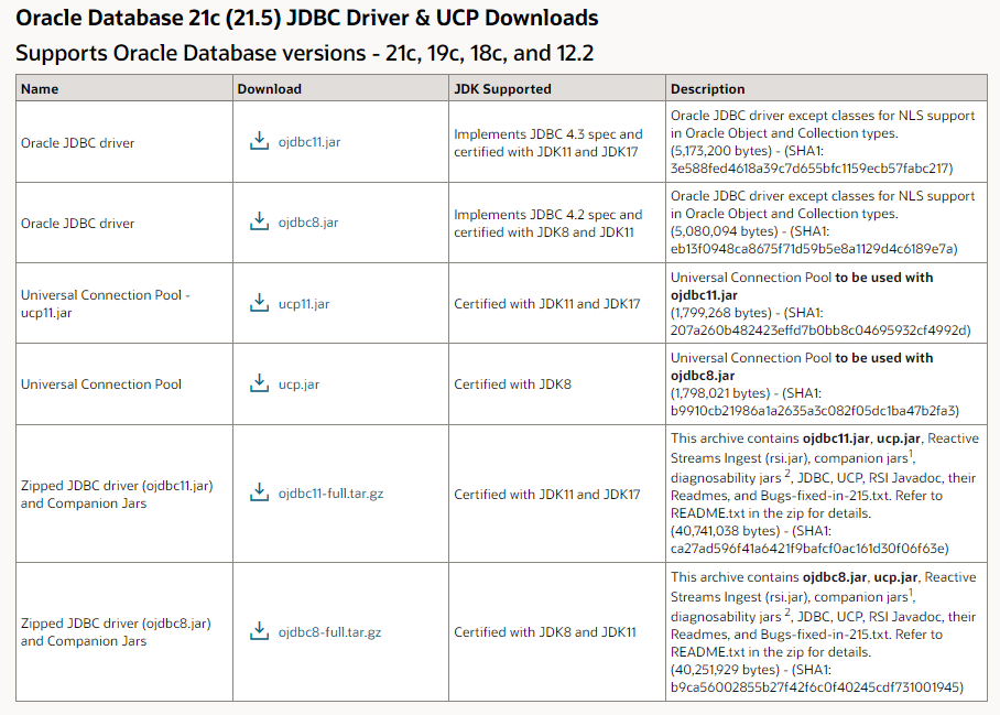 페이지를 한 번 미리 살펴보면 Oracle 21c, Oracle 19c, Oracle 18c JDBC Driver를 제공하고 있으며 그나마 ojdbc8과 ojdbc10.jar, ojdbc11.jar만 제공하고 있습니다. 쉽게 생각하면 이전 버전들은 이제 관리 대상이 아니라는 의미입니다.