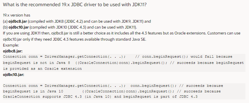 조금 흥미로운 내용은 JDK 11 버전과 JDBC driver 19.x 버전을 사용할 경우에는 JDBC 4.3 SPEC이 필요하지 않다면 ojdbc8.jar를 추천하고 있습니다.