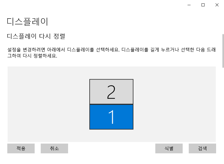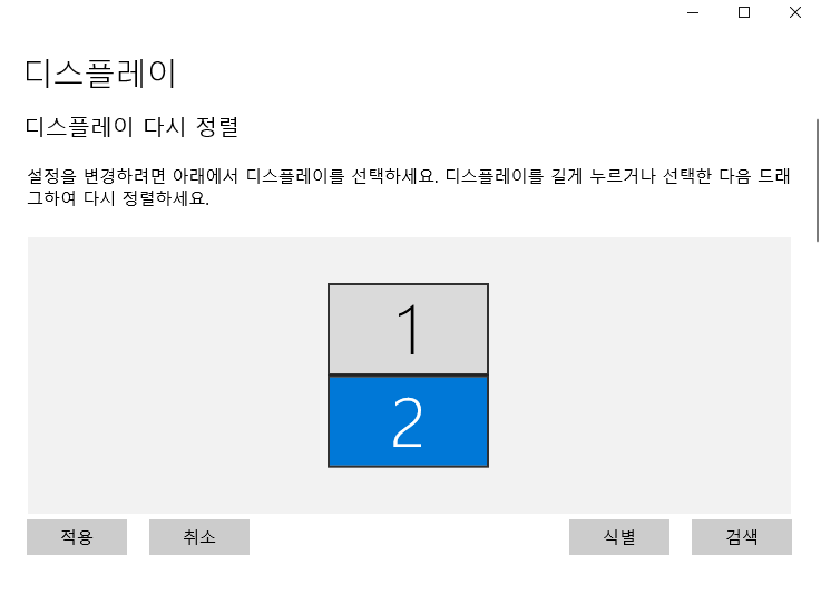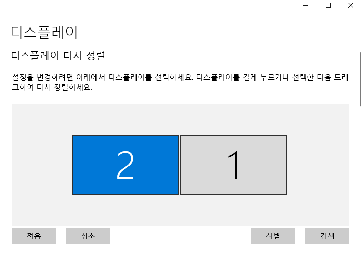 주 모니터에 따라서 설정이 1번이 왼쪽, 2번이 오른쪽이 되기도 하고, 좌측에 2번이 올 경우도 있습니다.
