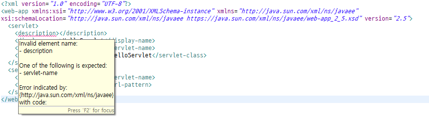 web.xml을 열어서 살펴보면, 처음 등록한 서블릿에 관련한 내용이 추가되고 나서 아래와 같은 오류가 발생합니다. Invalid element name: -description이 뜨며, 해당 행을 삭제하면 계속 에러가 전파되면서 다른 부분에도 오류가 뜹니다.