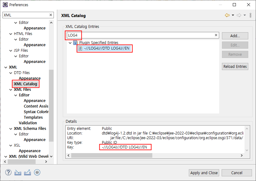 XML Catalog Entries에서 키워드인 LOG4를 입력하면 LOG4가 설정되어 있는 것을 볼 수 있습니다.