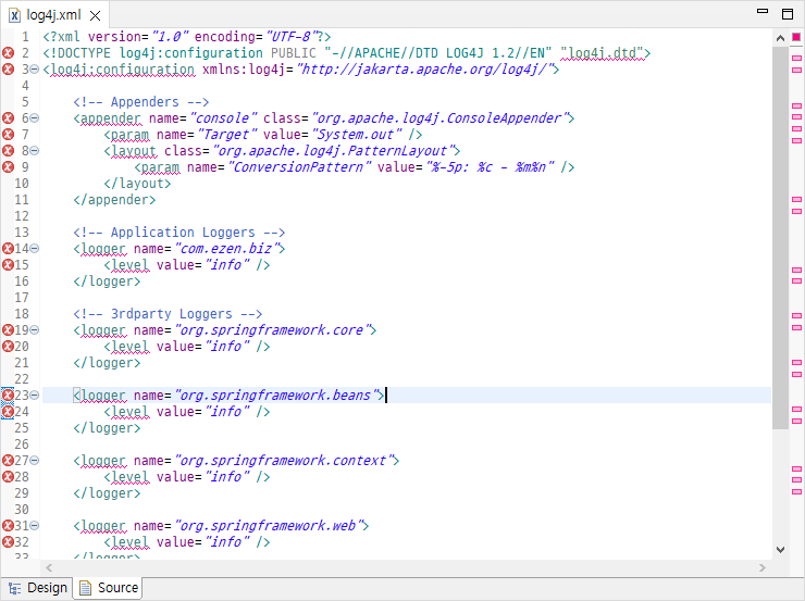 Spring Legacy Project를 처음 등록하고 나서 log4j.xml 파일을 열어보니 다수의 에러가 발견되었습니다.