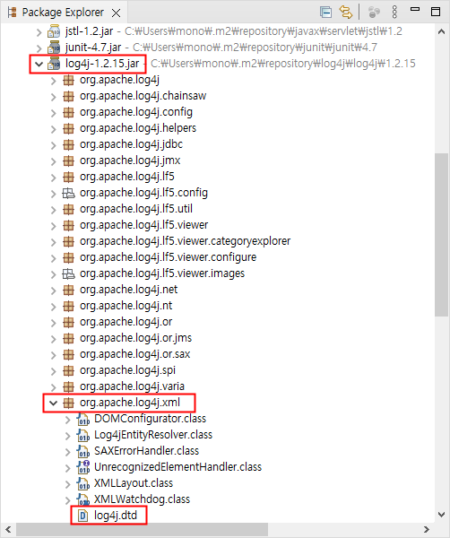 Maven Depedencies에서 log4j.jar 파일을 찾습니다. 이 파일을 확장하면 org.apache.log4j.xml을 찾을 수 있고 그 안을 살펴보면 log4j.dtd가 있는 것을 확인할 수 있습니다.