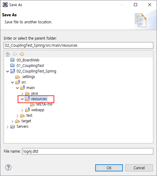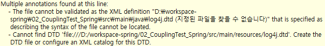 Cannot find DTD 'file:///D:/workspace-spring/02_CouplingTest_Spring/src/main/resources/log4j.dtd'.
