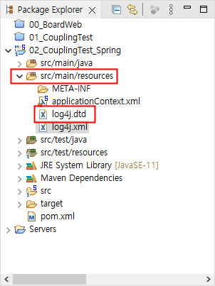 1.2절에서와 같이 Maven Dependencies에서 log4j.dtd 파일을 찾습니다.