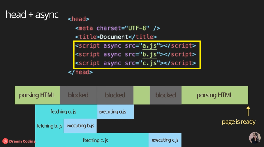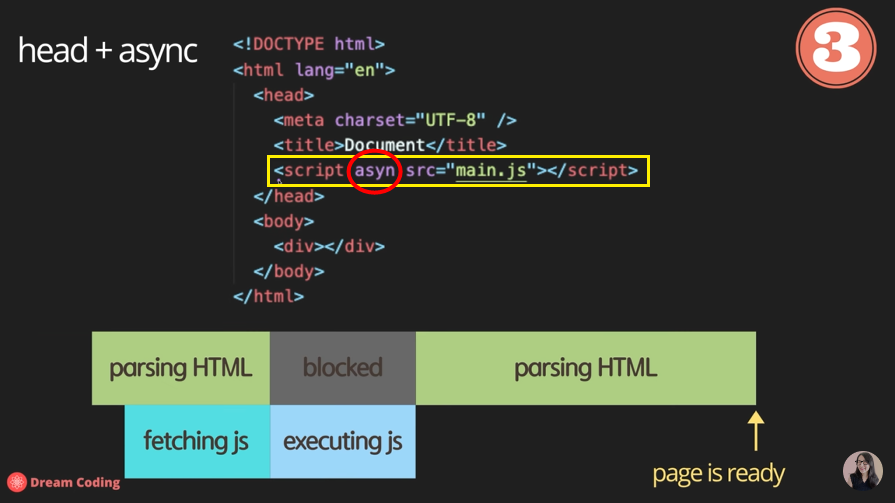 <script> 태그를 만나면, 실행을 멈추고 js파일을 다운로드한 다음 실행, 이 시간 동안은 HTML 해석이 중단된다.