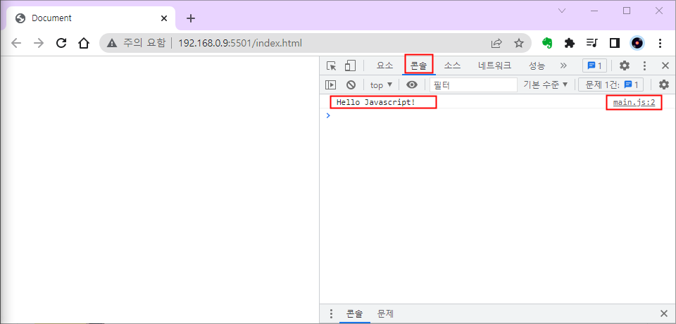 먼저 script로 js파일을 포함하는 index.html을 작성하고, VSCode의 LiveServer를 실행해서 크롬 브라우저에 띄웁니다. 그다음 [Ctrl + Shift + i]로 개발자 도구를 띄우면, 콘솔 화면에 메시지가 출력된 것을 확인할 수 있습니다.