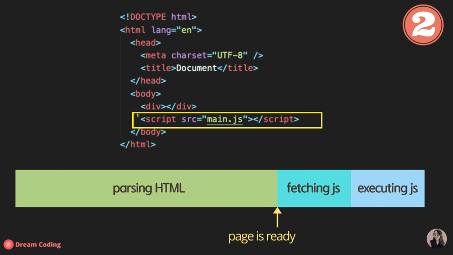 <script> 태그를 만나면, 실행을 멈추고 js파일을 다운로드한 다음 실행, 이 시간 동안은 HTML 해석이 중단된다.