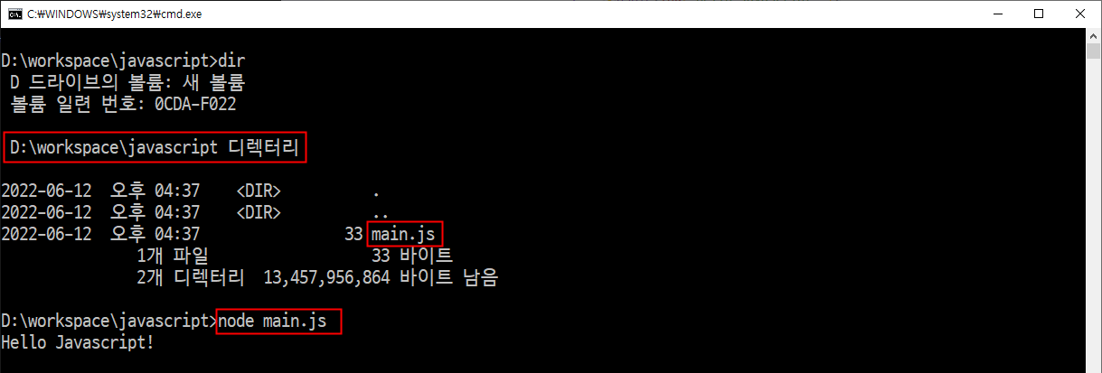 위의 코드를 main.js로 저장하고 node.js를 이용하여 실행해봅니다.