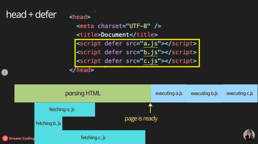 다수의 js 파일이 존재하는 경우에도 모든 파일을 다운로드하고 나서, HTML 파싱이 완료된 다음 script문을 기재한 순서대로 js를 실행하므로 가장 안정적으로 동작하는 옵션이라고 할 수 있다.