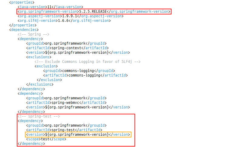 현재 사용 중인 스프링 프레임워크의 버전을 통일하기 위해서는 <version> 태그의 값properties에 설정되어 있는 값을 가져올 수 있도록 ${org.springframework-version}로 설정하여야 합니다.