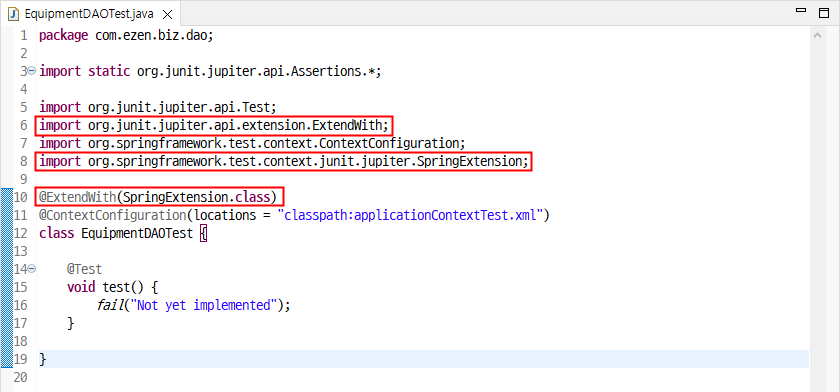 JUnit5에서는 @ExtendWith를 사용해서 확장할 수 있으며 이때 필요한 클래스는 SpringExtension.class입니다.