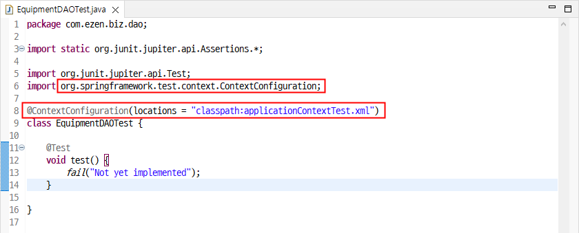 스프링의 어노테이션 정보를 로드하기 위해서는 applicationContext.xml 파일을 읽어 들여야 합니다. JUnit에서 @ContextConfiguration을 사용하여 파일을 지정할 수 있습니다.