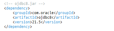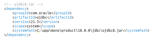 pom.xml 파일의 ojdbc.jar 설정은 <scope>에 system으로 설정되어 있고 <systemPath>에 파일의 실제 경로를 적어줍니다.
