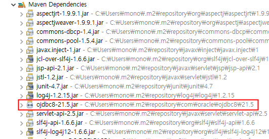 Maven Depedencis에서 확인해보면 파일의 위치가 다른 Maven 경로는 Repository를 참조하고 있지만 ojdbc8.jar 만 다른 곳을 참조하고 있는 것을 확인할 수 있습니다.