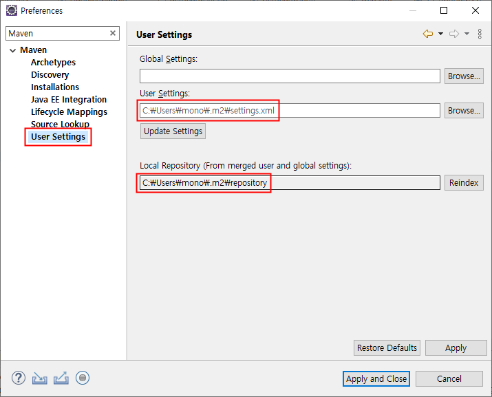 그중 User Settings 부분을 보면 저장소(Local Repository) 위치와 설정 파일(User Settings) 위치를 확인할 수 있습니다.